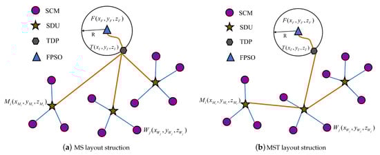 Figure 1 briefly describes the subsea production control system. The control signals flow from FPSO to SDU through the umbilical before finally arriving at SCM through the flying line. The configuration of the lazy wave umbilical is considered as an appropriate approach for a deepwater oilfield, due to its advantages of accommodating FPSO offsets, decoupling FPSO motions from the touch down point (TDP) of the umbilical and reducing the hang-off tension [28,29,30,31]. According to the characteristics and development strategies of offshore fields, two main pipe layout structures for the subsea production control system were developed: the multi-layer star structure (MS) and multi-layer star-tree structure (MST) [32]—as shown in Figure 2. In the MS structure, all SDUs are connected to FPSO, while in the MST structure, all SDUs are either directly or indirectly connected to the FPSO. In order to determine the optimal layout for the two layout structures, this paper establishes a layout optimization model for the subsea production control system, with the aim of obtaining the lowest construction cost.