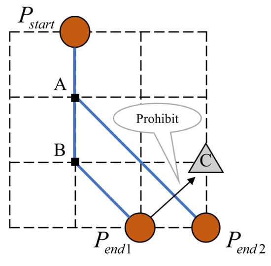 The seabed terrain is composed of discrete grid points, so that the obstacle area is composed of many interconnected points. The pipeline route must not access the obstacle area and the pipe should not cross. To solve these two problems, the obstacle points are inaccessible, which will result in the pipeline route not entering the obstacle area. However, when this situation occurs for in Figure 3, though no obstacle points were searched, the pipelines appeared to cross, which should be prevented in the route search process. Therefore, point C should be unreachable in this case. With both approaches, pipeline crossings and obstacles can be addressed. The process of the A-star algorithm is as follows.