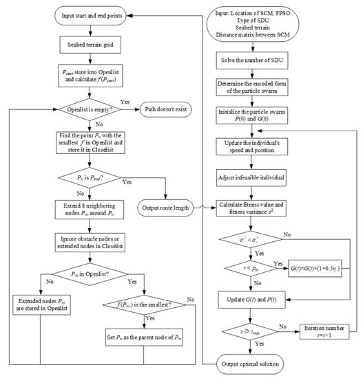 For the layout problem of the subsea production control system, the number of SDUs, the positions of SDUs and TDP, the route of functional pipelines and the connection topology of the functional pipelines need to be determined. The essence of the layout of the subsea production control system is to select the suitable facilities positions in 3D space and simultaneously determine their connection relationships and connection routes, so it is a complex nonlinear optimization problem. Compared with the traditional optimization method, the intelligent optimization method can effectively solve the nonlinear optimization problem, thus the hybrid intelligent optimization algorithm is selected to integrally optimize the layout of the system. For the engineering problem of complex 3D deployment, Nasri et al. [33,34] established multi-objective optimization models for the 3D deployment of wireless sensor networks and IoT networks and solved the models with intelligent optimization algorithms. Therefore, it can be inferred that the intelligent optimization algorithm can efficiently solve complex problems. In this research, in order to obtain an optimal layout, a hybrid algorithm combining AMPSO and A-star is proposed to solve the problem. The AMPSO algorithm was adopted as a main framework of the hybrid algorithm to optimize the position of SDUs and TDP, the functional pipeline connection topology and the A-star algorithm which was embedded in the AMPSO algorithm for obtaining the functional pipeline route in each iteration.