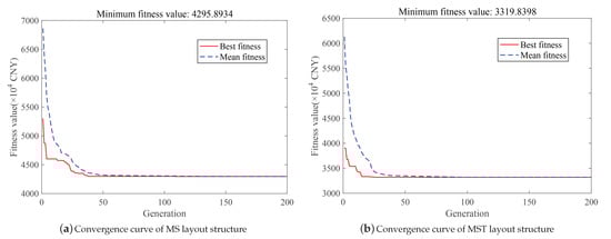 The model is solved in MATLAB by applying the above parameters and the mentioned algorithms. Due to the complexity of the calculation, the positions of SDU and TDP are selected at the grid nodes of seabed terrain. The convergence curves of the hybrid algorithm for the functional pipeline cost for the MS and MST layout structure are shown in Figure 6. The x axis represents the iteration steps and the y axis represents the fitness value, which is the cost of the functional pipeline. The red line represents the optimal fitness curve and the blue dotted line represents the historical optimal average fitness curve. After approximately 50 iterations, the historical optimal average fitness curve and the current optimal fitness curve overlap, which indicates that the iterative process converges and obtains an optimal layout. The runtimes of the hybrid algorithm for MS and MST layout problems are 12,266.4 s and 15,453.4 s. Considering the swarm size and the number of nodes, the running time of the hybrid algorithm is acceptable.