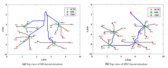 For the MS and MST pipeline layout structures, a binary number——is applied to describe the connection relationship between SDU and SCM. Let mean that the ith SCM is connected to the jth SDU, otherwise, . The numbers of SDUs and SCMs are m and n, respectively. Thus, forms a connection matrix . The connection constraints between SCM and SDU are as follows: