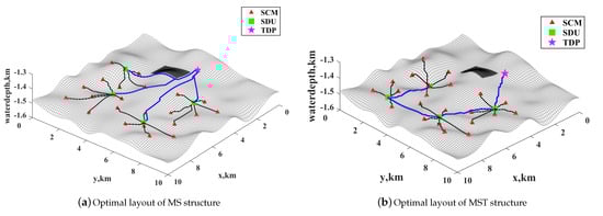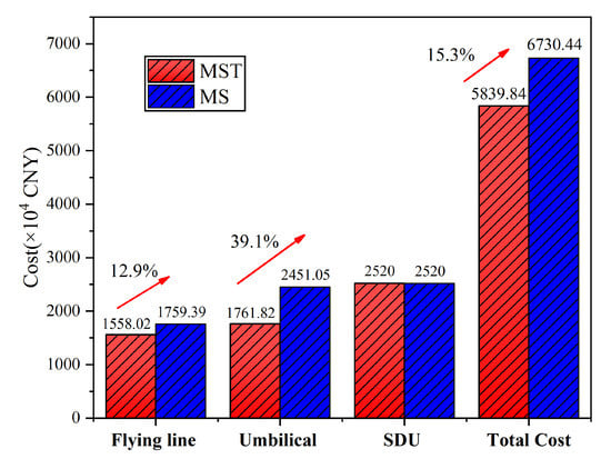 Figure 9 shows the overall comparison of the optimization results for the two layout structures. Due to the MST layout structure, the cost of the flying line and umbilical are 12.9% and 39.1% higher than the MS layout structure. The total cost is 15.3% higher. From the economic viewpoint, the subsea production control system of the MST layout structure is superior.