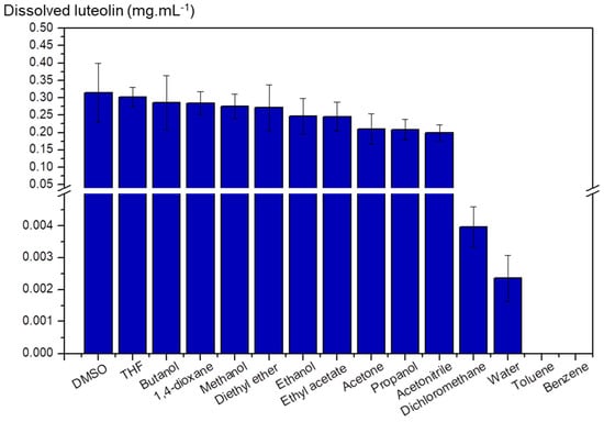 - Shakeel, F.; Haq, N.; Alshehri, S.; Ibrahim, M.A.; Elzayat, E.M.; Altamimi, M.A.; Mohsin, K.; Alanazi, F.K.; Alsarra, I.A. Solubility, thermodynamic properties and solute-solvent molecular interactions of luteolin in various pure solvents. J. Mol. Liq. 2018, 255, 43–50. [Google Scholar] [CrossRef]
