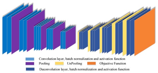 The structure of the SegNet network is shown in Figure 3. It can be seen from Figure 3 that the structure of the convolution neural network is approximately symmetrical. In the input layer of the network, the light blue layer is the convolution layer, batch normalization, and activation function; the purple layer is the subsampled layer; the light yellow layer is the upsampling layer; the dark blue layer is the deconvolution layer, batch normalization, and activation function; and the subsequent dark yellow layer is the objective function layer. The first half of the whole network is called the “coding” network, which uses the first 13-layer convolution network of VGG-16, and the second half is the “decoding” network. The coefficient feature graph obtained by the coding network is restored to the dense feature graph by deconvolution and upsampling. The last layer of the network is the soft connection layer, and the maximum value of different classifications is the output to obtain the final segmentation graph.