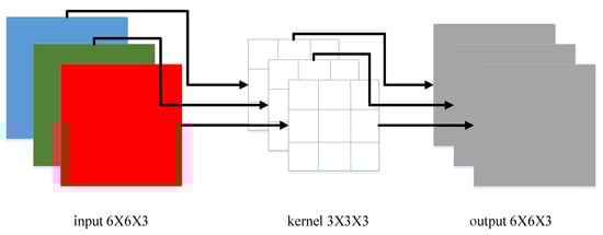 Depthwise separable convolution [22] includes a depthwise convolution and a pointwise convolution. When inputting a pixel, three-channel picture data (shape is 6 × 6 × 3), in the convolution operation, use a convolution kernel; Padding = 1, Stride = 1. After the convolution operation was completed, there were three feature images, with a feature size of , as shown in Figure 4. The convolution kernel shape in this case is: