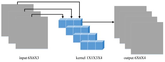 Pointwise convolution is a weighted combination of the characteristics of each input channel. The size of the convolution kernel used is . is the number of input channels in the point-by-point convolution layer. After pointwise convolution, a new feature graph is generated with characteristic information on the channel depth, as shown in Figure 5. The size of the convolution core of this layer is:
