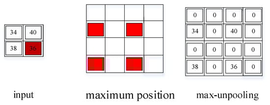 Unpooling is the operation of increasing the image resolution and is the inverse operation of pooling, in which the position index information of the maximum value retained by the red operation is recorded during the max-pooling operation in the coding network part of the convolutional neural network, and the information is used to expand the feature graph when the max-unpooling operation is carried out in the decoding network. The specific operation is the maximum position of the maximum value. Except for the position of the maximum value, the rest is 0, as shown in Figure 6.