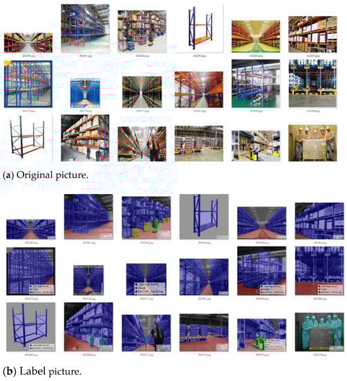 The convolution neural network established in this paper learns image features from label data, so it needs a distribution center environment image dataset with tags. We used the self-built dataset, including the warehouse environment picture dataset, including 469 logistics distribution center warehouse environment pictures, pictures from Google, Baidu, Bing, and other search engines. The dataset part is as shown in Figure 8. Because the training convolution neural network needs labeled label data, and the dataset built in this paper is only the original picture, we needed to label these pictures manually. The labeling tool was LABELME. In the dataset label, there are six types of tags: shelf, AGV car, pedestrian, ground, pallet, goods. Therefore, these six kinds of objects were segmented in the experiment.