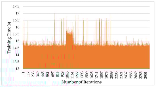 In order to compare the difference between the network model based on depthwise separable convolution and the original model, the same training set is used to train the model in the environment of the same hardware equipment. In this paper, 375 pictures were used for training and 94 pictures were used for testing. The experiment used six types of tags for training, with a batch size of eight. There were 3000 iterations and 64 epochs of training, and the time consumption in the training process is shown in Figure 9 and Figure 10.