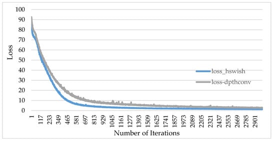 In order to compare the training results of the network model using the H-Swish activation function with that of the network model using the ReLU activation function, this paper used the same dataset to train the network model. The two models went through 3000 iterations each, and the loss value in the training process is shown in Figure 11 below:
