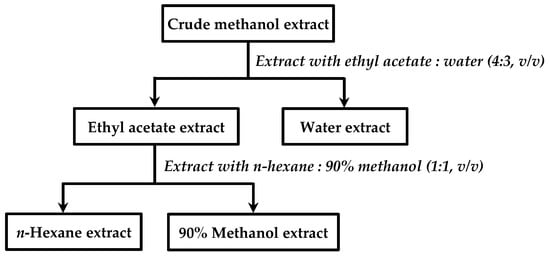 The crude methanol extracts of designated medicinal herbs were partitioned by a two-phase solvent system ethyl acetate: water (4:3, v/v), with solid: liquid ratio (1:4, g/L) in the separating funnel. Shook vigorously and allowed for the solvent layer to separate completely for 1 min. After phase separation, the water layer was then collected, followed by the partial extraction process, which was repeated four times with the same ratio to obtain ethyl acetate layer and water layer separately. All ethyl acetate layers and water layers were combined, respectively, and then the solvents were removed using a vacuum evaporator to obtain ethyl acetate extract and water extract. Ethyl acetate extract was then partitioned in a two-phase solvent system consisting of n-hexane: 90% methanol (1:1, v/v). This step was performed the same as the first partition step to yield n-hexane phase and 90% methanol phase. The solvent removal was done by using a vacuum evaporator to obtain n-hexane extract and 90% methanol extract. The partial extracts were then stored at 4 °C. The partial extraction process is shown in Figure 1.