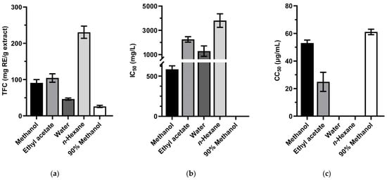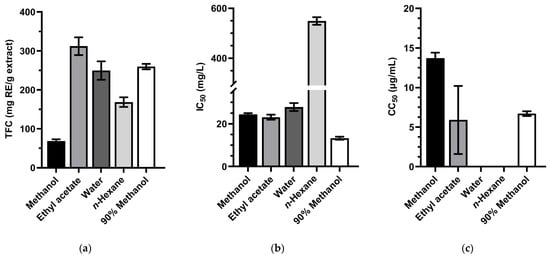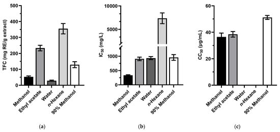 The total flavonoids content, the antioxidant activity, and the cytotoxicity effect of the extracts from S. torvum leaves were evaluated and designated in Figure 4 and Tables S1–S3. The highest TFC value was found in n-hexane extract (230.64 ± 16.74 mg RE/g extract).