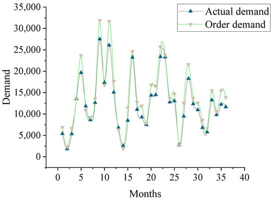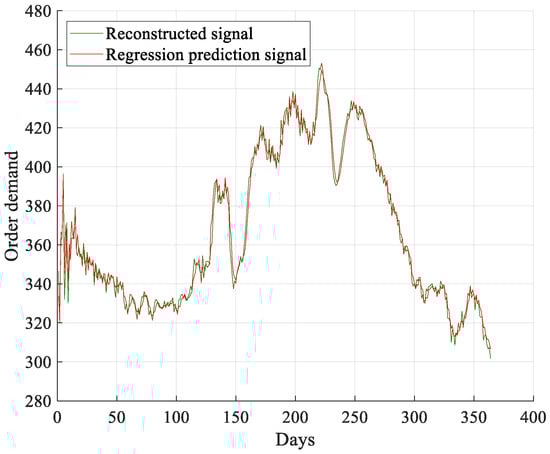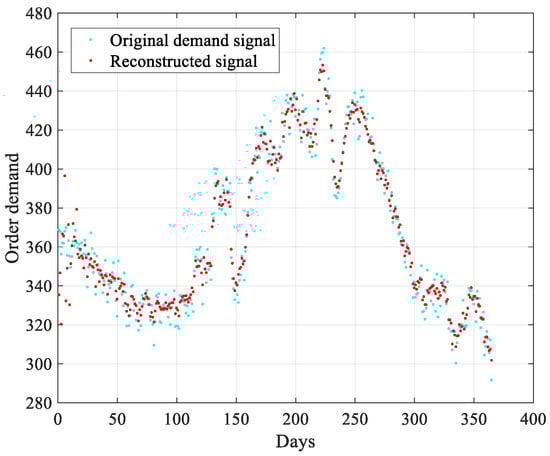 Figure 7. Through comparison, it is found that except for a few discrete sample points at the left end, the amplitude of the reconstructed signal in the figure decreases in varying degrees at each sample point, and most of them converge to the interior of the original demand signal. In addition, it can be clearly seen that the trend of the reconstructed signal tends to be smooth on the whole. In a practical sense, the jitter of the original demand signal is reduced by eliminating the demand noise, making the order demand data closer to the actual demand. The reason why a few sample points in the reconstructed signal deviate greatly from the original signal trajectory may be due to the limitations of VMD itself, which is associated with the use of