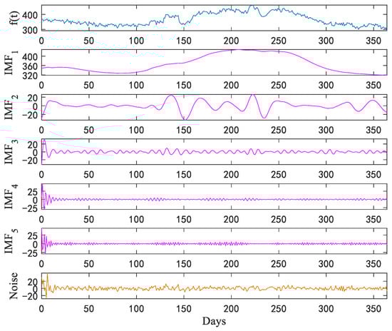 The VMD process uses the same parameter settings as the original code written by dragomiretskiy, who proposed the method. The quadratic penalty factor , the initial center frequency and the convergence criterion . Since the number of modal decomposition needs to be defined in advance, but it can be readjusted through Fourier transform analysis, is preset here. The parameters of SVR are set by default in LIBSVM3.22 software package of MATLAB.
