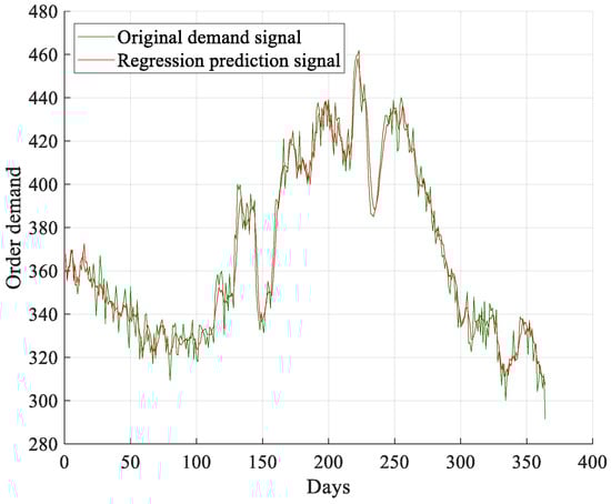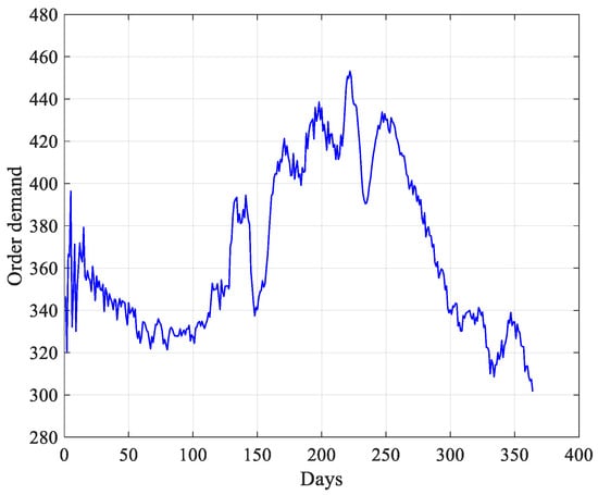 Figure 4, take the power battery order demand data of the enterprise from January 2019 to January 2020 as the test sample, namely the original demand signal in the figure, and the sampling interval of data sample points is one day. There are 365 sample points in this period, and the measurement unit of order quantity is ton. Considering that the lead time of the production plan made by the enterprise’s actual production activities is about one week, without losing its generality, in this paper, the demand of the next 1~7 days will be regressively predicted and analyzed based on the demand of the enterprise on that day.