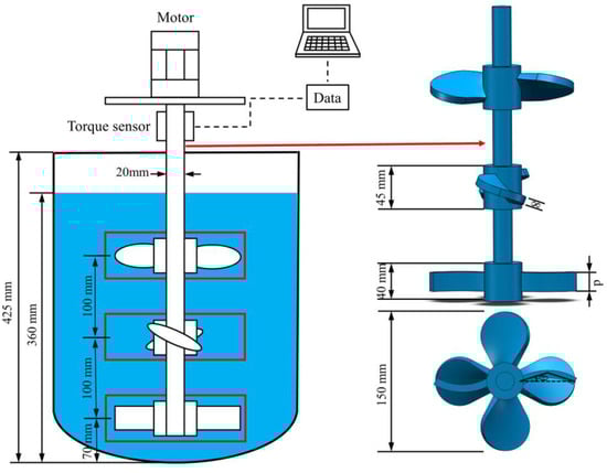 As shown in Figure 1, the stirring vessel is a cylindrical plexiglass tank without a baffle and with an elliptical head. The inner diameter of the stirring tank is T = 300 mm, and the heights of the liquid level and elliptical head are H = 425 mm and h = 75 mm, respectively. The tank includes water, pure glycerin and glycerin–water solutions of different concentrations. The temperature of the experiment was fixed at 20.0 ± 0.2 °C, and the initial height (HL) of the liquid solution was maintained at 360 mm. In the three-blade combined agitator (TBCA), the distance of the blades from the bottom is C1 = 70 mm, and the distance between the blades is C2 = C3 = 100 mm. In the experiment, glycerin and water were used as working fluids, and a torque sensor was used to measure the power consumption of the agitator under different Reynolds numbers.