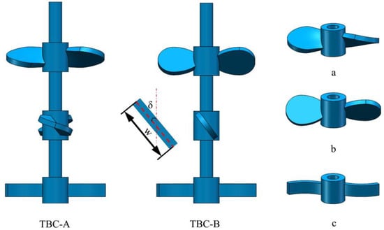 The three-blade combined agitator (TBCA) is composed of two propeller blades of the same type and a curved blade. The blade width of the curved blade is d = 20 mm, the nominal diameter of the blade DJc = 150 mm, and the inclination angle of the front and rear blades of the curved blade is θ = 30°. The propeller blades used in the experiment can be divided into helical propeller blades a and planar propeller blades b, according to the shape of the blades. The nominal diameters of the two propeller blades are DJ = 150 mm. Figure 2 shows the geometric details of the TBC-A type agitator, TBC-B type agitator and constituent blades a, b, and c. Table 1 shows the detailed structural parameters of the two propeller blades, including the section leaf width and angle between the section and stirring axis.