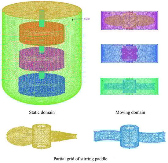 SolidWorks software was used to establish the geometric model, and the DesignModeler module of ANSYS software was used to divide the calculation domain of the stirred fluid. The calculation domain included two areas, specifically, the dynamic and static domains. The dynamic area involves three stirring and rotating areas, as shown in Figure 3. Due to the complex structure of the agitator, it is difficult to manually divide the structured grid as the process is time-consuming and labor-intensive. Therefore, in the ICEM CFD framework, unstructured tetrahedral meshes are used to mesh the mixing model, and local meshes are refined for the dynamic area and blades. The maximum sizes of the overall and local grids are 8 mm and 4 mm, respectively.