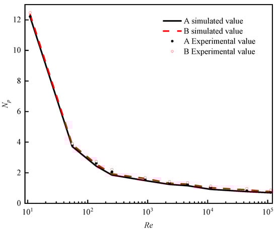 The power numbers determined in the ten conditions through numerical simulation and experiments are shown in Table 3. According to the results, the corresponding power number curve was drawn, as shown in Figure 5.
