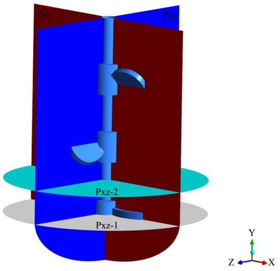 The 2nd (high-viscosity laminar flow) and 9th (low-viscosity turbulent flow) operating conditions in Table 2 were considered to examine the velocity field and turbulent kinetic energy distribution when the fluid in the stirred vessel is water and glycerin, and the stirring speed N = 2 r·s−1. As shown in Figure 6, four sampling planes were selected, in which sampling plane 1 is located in the middle longitudinal section Pxy of the stirring vessel, sampling plane 2 is located in the middle longitudinal section Pyz of the stirring vessel, sampling plane 3 is located in the horizontal section Pxz-1 70 mm from the bottom and sampling plane 4 is located in the horizontal section Pxz-2 with a distance of 120 mm from the bottom. The axial position y = 120 mm is located in the joint action area of the bottom curved blade and middle propeller blade. Selecting this position for flow field velocity analysis can better reflect the flow field changes in the middle area of the curved blade and propeller blade.