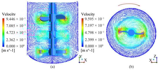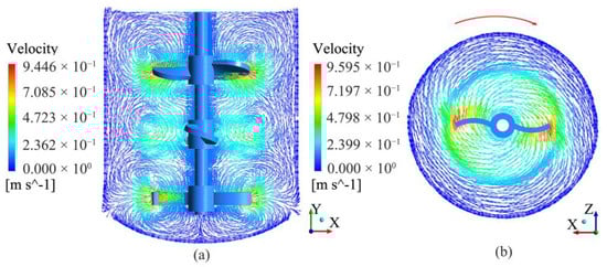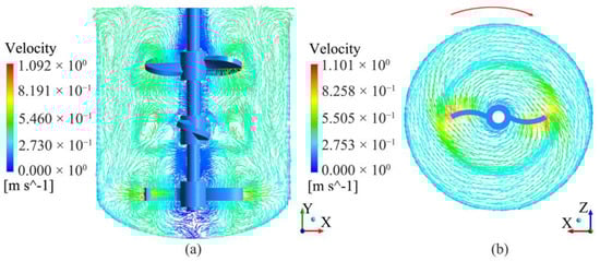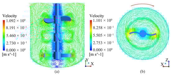 Velocity vector diagram when the medium is water and Re = 44,910. (a) TBC-B type agitator, Plane 1:XY,Z = 0 mm; (b) TBC-B type agitator, Plane 3:XZ,Y = 70 mm.