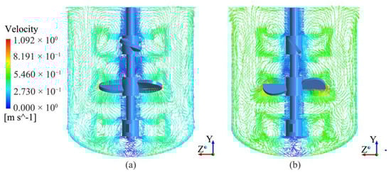 Velocity vector diagram when the medium in YZ section is water and Re = 44,910. (a) TBC-A type agitator, Plane 2:YZ,X = 0 mm; (b) TBC-B type agitator, Plane 2: YZ,X = 0 mm.