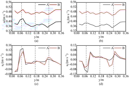 Horizontal and vertical positions in the middle longitudinal section (Pxy) of the mixing vessel were selected to specify the speed distribution of the TBC-A and TBC-B agitators. Figure 13 and Figure 14 show the velocity distributions at radial position r = 90 mm and axial position y = 120 mm when the stirring medium is water and Re = 44,910, respectively. Figure 13 shows that the total speed of the TBC-B-type agitator is considerably higher than that of the TBC-A-type agitator, and the maximum increase in the total speed is 30.3%. Except for those at positions near the curved blades, the axial velocities of the two agitators are similar to the total velocity of the fluid, and the axial velocity of the TBC-B-type agitator is significantly higher than that of the TBC-A-type agitator. The bottom position of the mixing vessel corresponds to a large radial velocity due to the action of the curved blades. Figure 14 shows that at y = 120 mm, the total speed and axial speed of the TBC-B type agitator are greater than those of the TBC-A type agitator, and with the increase in the radial coordinate, the total speed of the TBC-B type agitator first decreases and later increases until the end of the blade, with a maximum difference udv = 0.106 m·s−1 in the corresponding area of the blade end. The radial speed of the TBC-B type agitator at the far end of the blade is greater than that of the TBC-A type agitator, while the tangential speed is always lower than that of the TBC-A type agitator. This analysis shows that in the near-paddle zone, the TBC-B agitator has a relatively large speed and a relatively uniform axial velocity, which can enhance the axial circulation capacity of the flow field. At the distal end of the blade, the axial and radial speeds of the TBC-B agitator are high, while the tangential speed is significantly reduced. This finding shows that the vertical distribution combination of the curved blades and central planar propeller blade b in the TBC-B agitator can increase the circulating flow capacity of the flow field. Without a baffle, the TBC-B agitator can weaken the tangential flow capacity of the flow field, which can help transfer energy to the area far from the agitator and enhance the uniformity of fluid mixing.