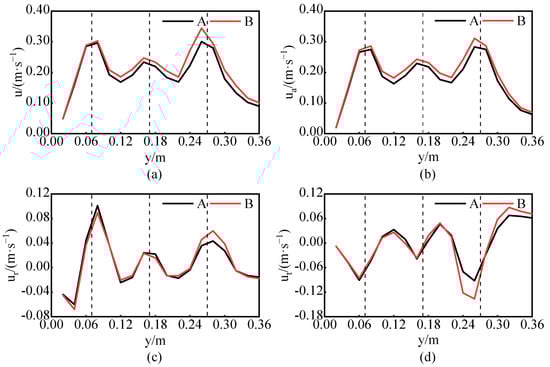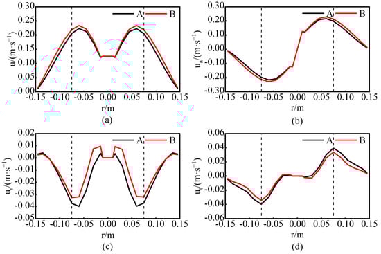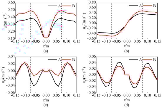 Velocity distribution at the axial position y = 120 mm when the medium is water and Re = 44,910. The distance between the two curves is the nominal diameter of the blade. (a) Total speed comparison; (b) Axial velocity comparison; (c) Radial velocity comparison; (d) Tangential velocity comparison.