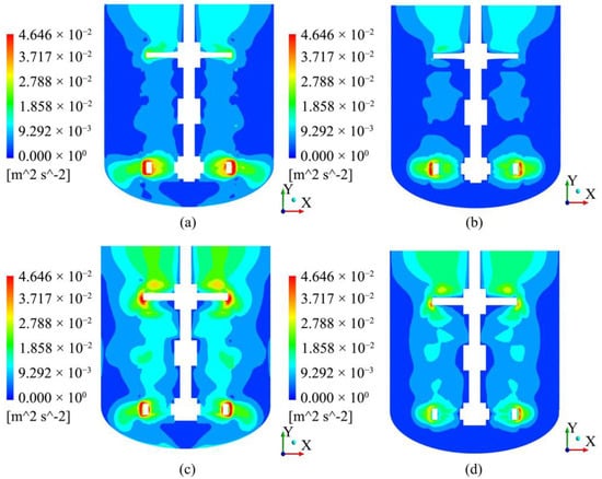 Cloud diagram for the turbulent kinetic energy in the XY section. (a) Re = 2316.5, μ = 0.023 Pa·s, TBC-A type agitator; (b) Re = 44,910, μ = 0.001 Pa·s, TBC-A type agitator; (c) Re = 2316.5, μ = 0.023 Pa·s, TBC-B type agitator; (d) Re = 44,910, μ = 0.001 Pa·s, TBC-B type agitator.