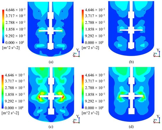 Cloud diagram of the turbulent kinetic energy in the YZ section. (a) Re = 2316.5, μ = 0.023 Pa·s, TBC-A type agitator; (b) Re = 44,910, μ = 0.001 Pa·s, TBC-A type agitator; (c) Re = 2316.5, μ = 0.023 Pa·s, TBC-B type agitator; (d) Re = 44,910, μ = 0.001 Pa·s, TBC-B type agitator.