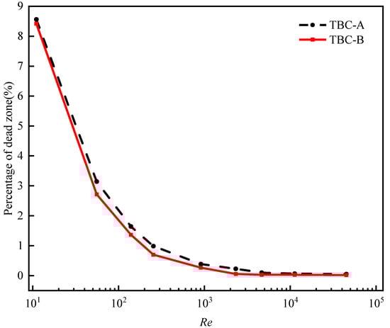 Figure 19 illustrates the comparison of the variation in the mixing dead zone percentage for two kinds of three-blade combined agitators (TBCAs) with the Reynolds number. With the continuous increase in Re, the dead zone percentage for the two kinds of three-blade combined agitators (TBCAs) gradually decreases from approximately 8.5% in the laminar flow state to less than 0.05%. When Re = 55.5, the percentage of the dead zone decreases to approximately 3%, indicating that the three-blade combined agitators (TBCAs) can fully mix the fluid under laminar flow, transition flow and turbulence. When Re = 44,910, the dead zone percentage of the TBC-A type agitator is 0.0216. Moreover, the dead zone percentage of the TBC-B type agitator is always smaller than that of the TBC-A type agitator, indicating that the mixing effect of the TBC-B type agitator is superior to that of the TBC-A type agitator.
