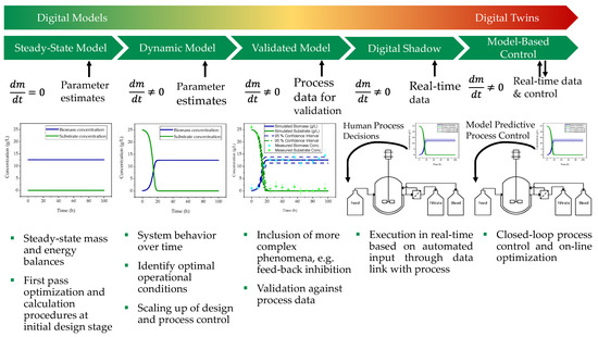 - Zobel-Roos, S.; Schmidt, A.; Uhlenbrock, L.; Ditz, R.; Köster, D.; Strube, J. Digital Twins in Biomanufacturing. Adv. Biochem. Eng. Biotechnol. 2021, 176, 181–262. [Google Scholar] [CrossRef] [PubMed]