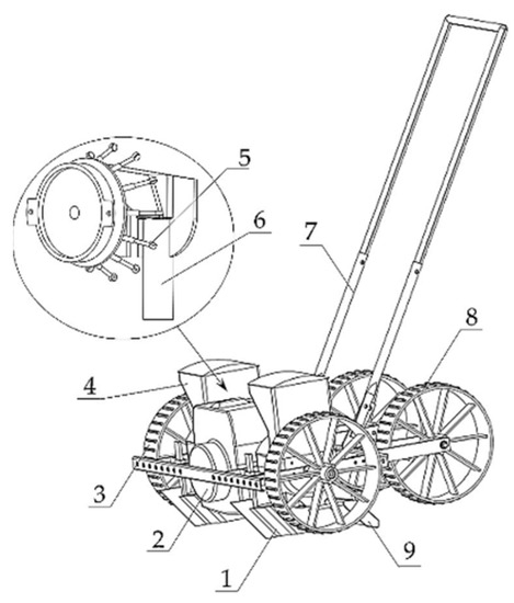 Structure diagram of the vegetable precision seeder: 1. opener; 2. engine; 3. driving wheel; 4. vegetable precision metering device; 5. seed scoop; 6. seed guide tube; 7. frame; 8. suppressing wheel; 9. soil covering device.