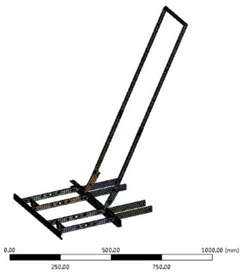 Since the seeding device frame is welded from the structural steel bracket and needs to fix a large number of key components, there are many solder joints and installation holes on it. In order to accurately establish the finite element model of the frame and obtain high-quality meshes, it is necessary to simplify the frame [20]. Therefore, the installation holes smaller than the mesh size and the change in material properties caused by solder joints were ignored, while the local characteristics, such as bolts, chamfers, and rounded corners, were ignored to save simulation time and simplify the frame into a rigid connection model [21,22,23]. The frame material was set as Q235 structural steel, and its elastic modulus was 210 GPa, Poisson’s ratio was 0.3, density was 7850 kg/m3, and yield strength was 235 MPa. The three-dimensional solid model of the frame was saved in igs format and imported into the finite element analysis software ANSYS Workbench. The mesh was divided by the ANSYS Mesh module, and the mesh quality was controlled by setting size. According to the size of the solid model, the element size was set to 5 mm. After surface meshing of the face, the total number of elements was 21,735, and the total number of nodes was 58,371. The finite element model of the frame obtained by grid division is shown in Figure 3.
