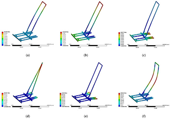 From the analysis of Figure 14, it can be seen that the six order natural frequencies of the optimized frame all show different degrees of increase, and no frequency exchange phenomenon occurs, which indicates that the natural frequencies can be effectively improved by increasing the fixed beam structure, and the resonance can be avoided.