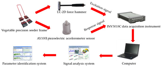 The test modal analysis was to decompose a complex multi-degree-of-freedom system into several subsystems. First, several low-order modes of each subsystem were obtained, and then each subsystem was assembled into a system of differential equations of overall motion according to the displacement coordination relationship or force balance relationship of adjacent systems, and the comprehensive characteristic problem of reduced degrees of freedom was derived [28]. Through the vibration test of the actual structure, the excitation force was applied to the machine and the response was measured; the modal parameters of the vibration system were identified; the transfer functions of each subsystem were solved, and the natural frequencies and the modal shapes were finally calculated. The test schematic diagram is shown in Figure 5.