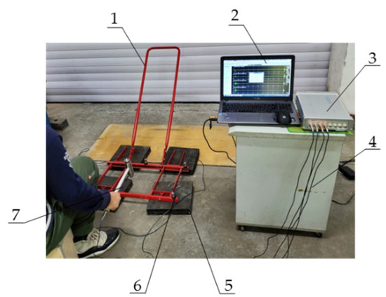 Modal test: 1. frame; 2. computer; 3. data acquisition instrument; 4. signal transmission line; 5. rubber block; 6. acceleration sensor; 7. force hammer.