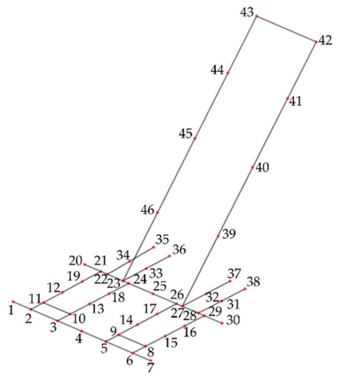 Among them, the layout of measuring points not only reflects the overall shape of the mechanism, but also the action point of external force and the structural intersection point. At the same time, it is necessary to ensure that all measuring points are excited by the force hammer and have a high signal-to-noise ratio [32]. Finally, a hammer model with 46 measuring points was established, as shown in Figure 7. The arrangement of response points requires that the nodes can be avoided and the response signals can be easily received. Acceleration sensors were arranged at 7, 25 and 30 measuring points of the hammer model.