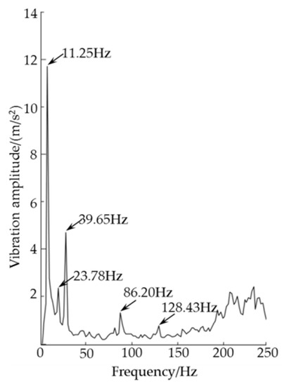 The firing order of the two-stroke engine is mainly the first order. In order to verify the accuracy of calculating the excitation frequency during normal working, the engine vibration condition was tested in the room. The engine speed was maintained at 700 r/min. The spectral characteristics of the engine were obtained by Fourier transform, as shown in Figure 8.