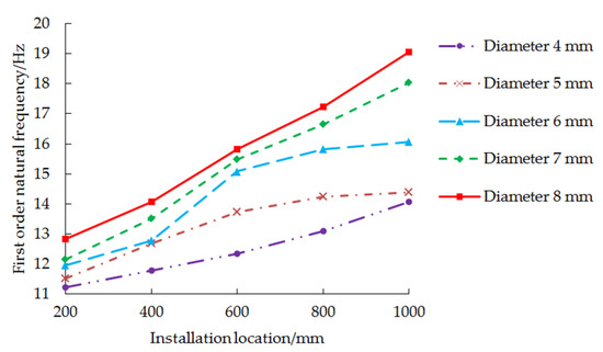 From the analysis of Figure 8, it can be seen that the first-order natural frequency of the fixed beam with the same diameter increases with the increase in the installation position, and the first-order natural frequency of the same installation position increases with the increase in the fixed beam diameter.
