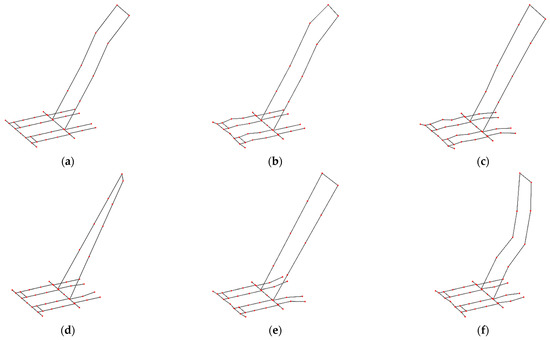 The modal shapes and corresponding frequencies of frame finite element modal analysis: (a) is the 1st order mode shape and its frequency is 11.43 Hz; (b) is the 2nd order mode shape and its frequency is 17.62 Hz; (c) is the 3rd order mode shape and its frequency is 28.25 Hz; (d) is the 4th order mode shape and its frequency is 42.30 Hz; (e) is the 5th order mode shape and its frequency is 62.17 Hz; (f) is the 6th order mode shape and its frequency is 76.78 Hz.