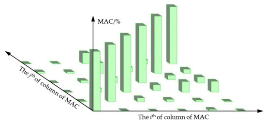 To verify the modal correlation of the test modes, the modal assurance criterion (MAC) was used to evaluate the modal correlation matrix, and its verification is shown in Figure 13. The MAC was the correlation coefficient between two vectors. The MAC value of two vectors of the same physical model was close to 1, while the MAC value between two vectors of different modes was smaller, indicating that the two modal vectors had approximately the same modality. The basic idea was to assume that the mass of the structure was approximately uniformly distributed, then the modal shapes of the structure have unweighted orthogonality. The modal correlation coefficient is defined as follows [35]: