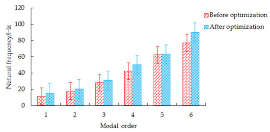 In order to describe whether the multi-order natural frequencies of the optimized frame have frequency exchange, the modal analysis for optimized frame structure was carried out, and the data were sorted into Excel 2010 to compare the natural frequencies of the frame before and after optimization, as shown in Figure 14.