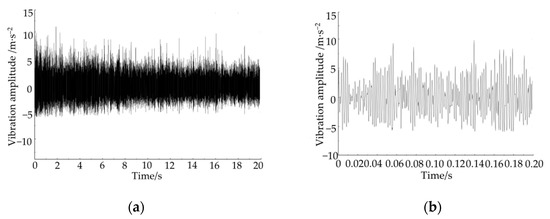 Vibration time domain signal waveform: (a) full-range waveform diagram of time-domain signal characteristics; (b) local waveform diagram of time-domain signal characteristics.
