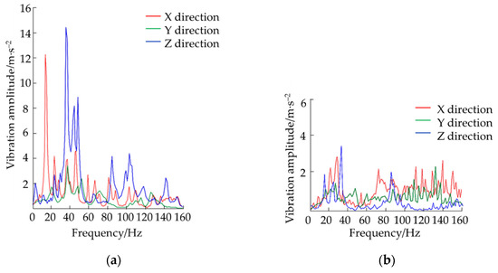 According to the analysis of Figure 14 and Table 4, before optimization, the violent vibration mainly appeared in the X and Z directions, and the vibration amplitude in the Y direction was low. After optimization, the vibration amplitude of each peak point in the three directions was significantly lower than that before optimization, among which the vibration amplitude of the maximum peak point decreased by 75.56% in the X direction, 35.52% in the Y direction, and 77.94% in the Z direction. The results showed that the vibration amplitude of the frame could be significantly reduced by increasing the fixed beam structure.
