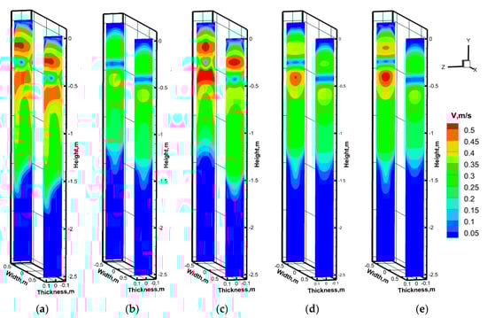 - The VP has an obvious brake effect on the surface velocity and the upper backflow velocity and can optimize the asymmetric distribution of the surface velocity and the upper recirculation velocity caused by the asymmetric arrangement of the SEN. The HP can obviously restrain the velocity of the lower downwards flow and can optimize the asymmetric distribution of the lower downwards velocity caused by the asymmetric arrangement of SEN.