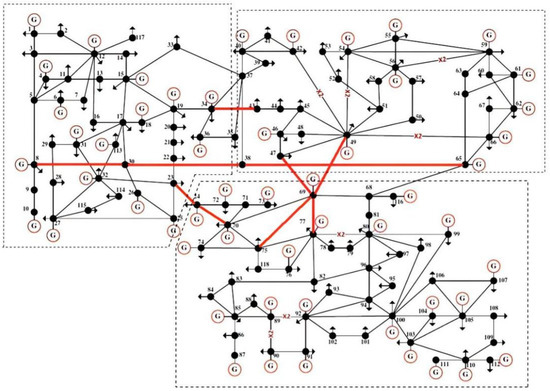 IEEE 118-bus system, with three partitions interconnected.