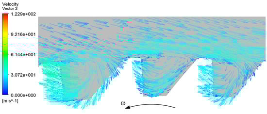 When the gear rotates at a high speed, the gear teeth push and drag the fluid on its surface to form a strong air vortex. Figure 5 shows the velocity vector diagram of the air flow field around the gear teeth. It can be seen from the figure that the fluid flow direction is opposite to the gear rotation direction, and the velocity is the relative velocity value in the fluid velocity triangle.