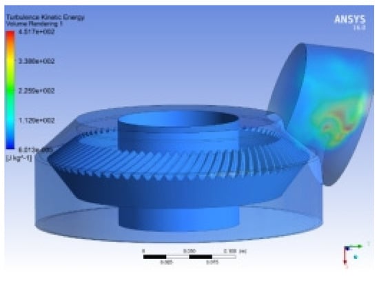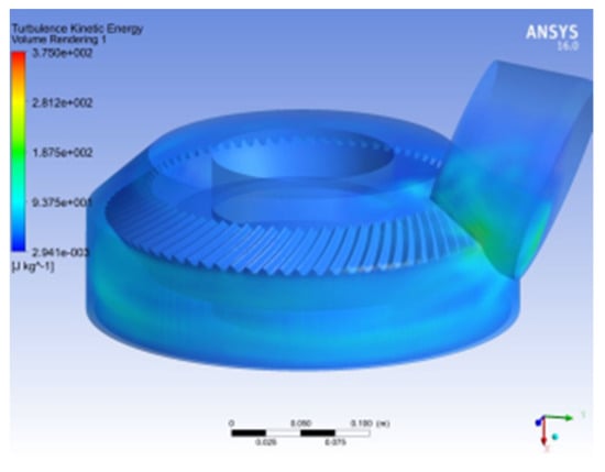 The energy loss caused by the windage of the gear pair would be dissipated as the turbulent motion of the fluid in the gearbox. The windage power loss represents the kinetic energy loss per unit time caused by the windage torque when the gear rotates. When the gearbox is closed, the lost kinetic energy is converted into heat energy through the viscous force between the fluid clusters, resulting in an increase in the turbulent kinetic energy of the fluid. Figure 13 shows the turbulent kinetic energy cloud diagram of the gear pair flow field.