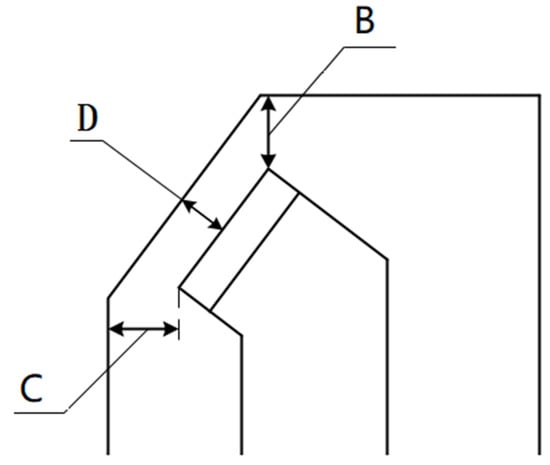 The main factors that affect the windshield to reduce the power loss of the gear pair are the clearance value between the windshield and the gear face, the clearance value between the tooth surface and the shaft surface, and the opening size of the gear pair engagement area on the windshield. This section verifies the influence rule of each factor through a numerical simulation experiment. The clearance between the windshield and the gear, namely the large end clearance (B), the small end clearance (C) and the tooth surface clearance (D) are the main factors affecting the performance of the windshield. The specific meanings of these three structural parameters are shown in Figure 11.